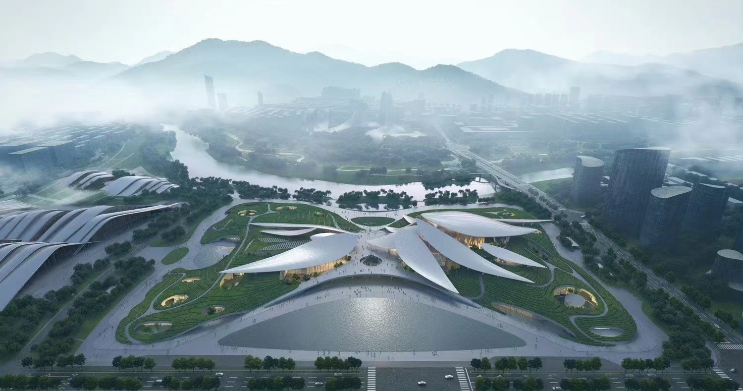 浙江安吉是“中國竹鄉”、“中國白茶之鄉”,也是“綠水青山就是金山銀山”理念的誕生地。安吉文化藝術中心鄰水望山,位于安吉“兩山”未來科技城的核心啟動區,項目所包含的大劇院、會議中心、文化館、工人文化宮、青少年活動中心、藝術教育中心等六處場館在此平緩鋪開,散落在青綠茶田和“竹葉”屋頂之下,如同一處大地藝術景觀。這里將是安吉未來聚集文化、生活、藝術、教育、自然的城市客廳。